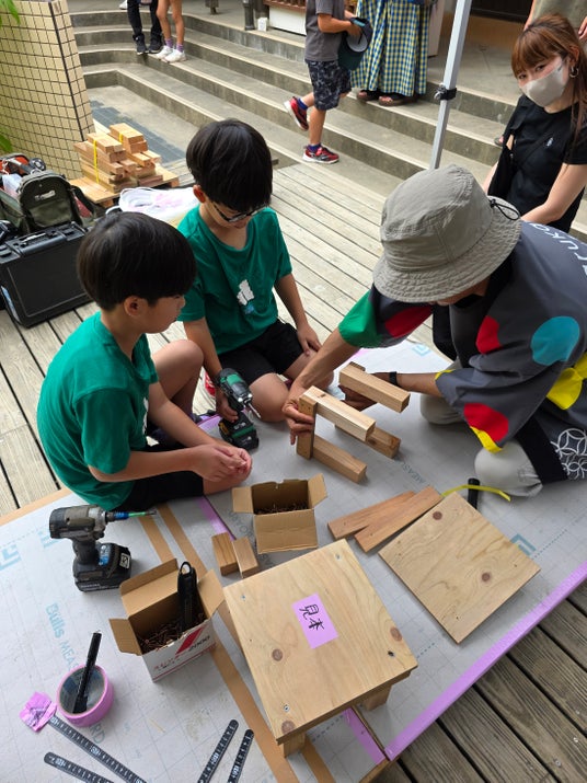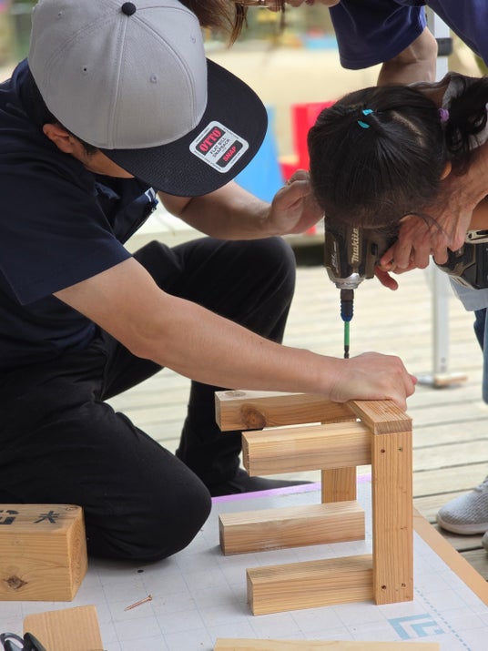 地元の木を使い、木の温もりや香りを肌で感じながら、小さな手で木をつかみ、夢中でつくる姿に笑顔があふれていました。