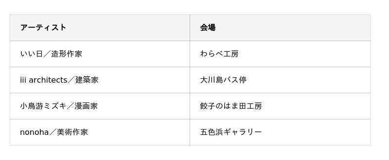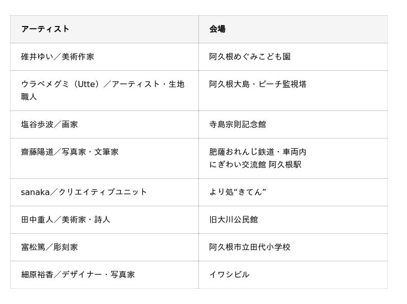 参加アーティストや鑑賞チケットの購入方法などの詳しい情報は、阿久根うみまち芸術祭公式サイトをご確認ください。