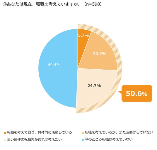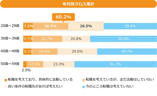 現在の転職意向を聞くと50.7%が転職を考えていることがわかりました。また年代別でみると20代では60.2%が転職を検討している結果となりました。