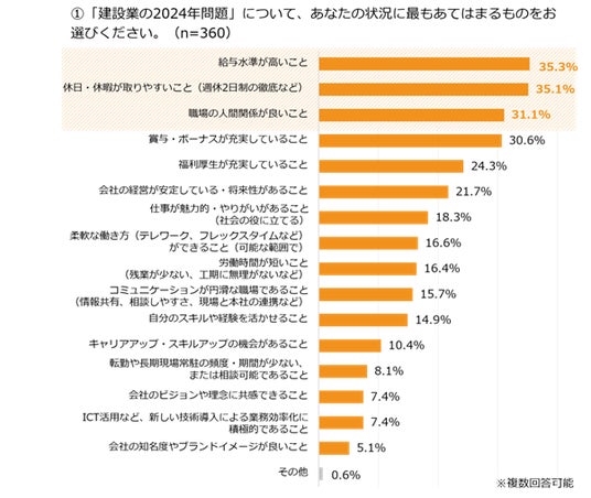転職先を選ぶ基準は、待遇や会社の将来性に加え、職場の人間関係も重視されています。自由回答では、建設業特有の働き方や教育の問題、下請け会社とのコミュニケーションのあり方、女性が活躍できる環境整備を求める声も聞かれました。具体的には「もっとコミュニケーションを取ったほうが職場の雰囲気がより良くなると思う」や「みんなが忙しくてコミュニケーションをとる時間がない。残業が定着しており、定時に帰りづらい」などです。
