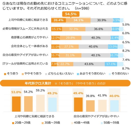コミュニケーションのしやすさについて「上司や同僚に気軽に相談できる」という質問に対し「そう思う」「ややそう思う」と回答した人は54.5%でした。年代別に見ると50代では49.2%となり半数を下回りました。