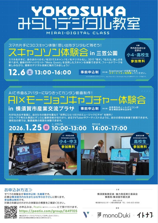 横須賀市におけるeスポーツ・メタバース事業のさらなる推進に寄与するため、小中学生を中心にマインクラフト・AIによる作曲やモーションキャプチャー・3Dスキャンなどの最新技術を体験しながら、「つくる・考える・伝える」を実践的に学ぶ機会を提供します。“リアルなデジタル体験”を通して、地域全体で未来の人材を育成します。