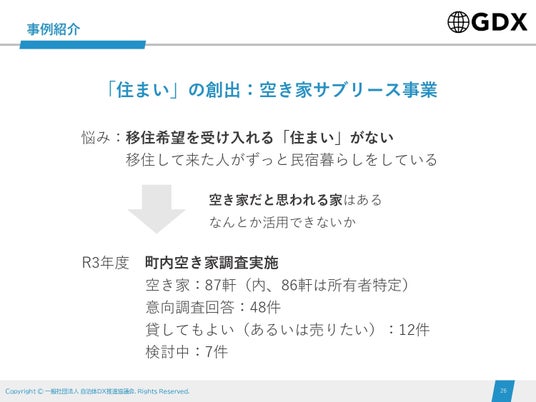 GDXが全国343自治体を対象に実施した調査(2025年1月~2月実施)に基づき、年間の移住相談件数(中央値47件)に対し、実際の移住者数(中央値15人)が少ない現状を報告。限られたリソースの中で、いかに相談から移住に繋げるかという「転換率」を高めることの重要性を強調しました。