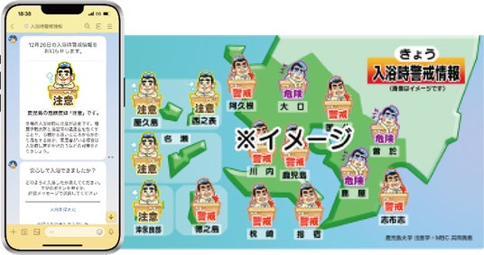 多くの方へ周知するため、鹿児島大学HPにて入浴時警戒情報を公開するほか、MBC南日本放送、NHK鹿児島放送局、KTS鹿児島テレビの天気予報、および南日本新聞の「きょうの天気」にて、入浴時警戒情報を発信しています。