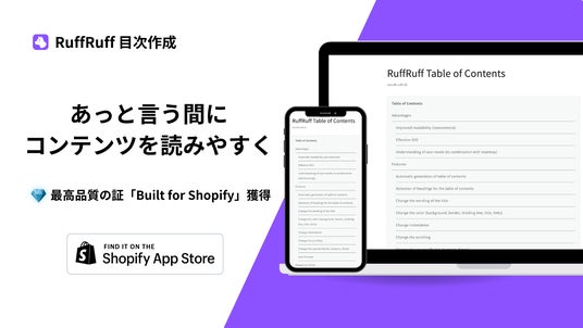 「RuffRuff 目次作成」は、ブログ記事や商品などのコンテンツに自動で目次を生成できるShopifyアプリです。