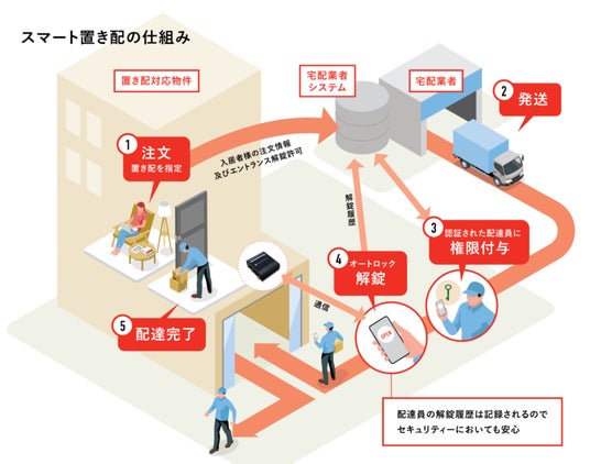 「スマート置き配」が導入されたオートロック付き物件では、入館権限を付与された配達員がデジタルキーを活用し、共用エントランスの鍵を安全に解錠することで、不在時でも各住戸の玄関前まで荷物の置き配が可能となります。これにより、再配達の削減や居住者の利便性向上を図るとともに、宅配に関するトラブルの軽減によって管理業務の効率化にも寄与します。