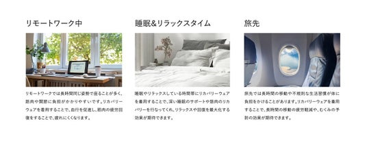 長時間同じ姿勢で座る場面が多いリモートワークやオフィスでの作業、旅先での長時間移動などで着用することによって、更なる疲労軽減が期待できます。