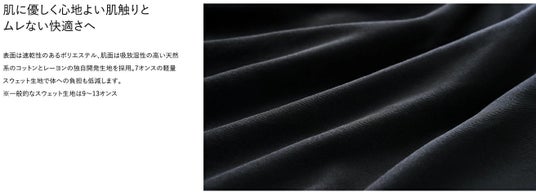 表面は速乾性のあるポリエステル、肌面は吸放湿性の高い天然系コットンとレーヨンの独自開