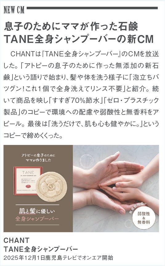 敏感肌と地球環境に寄り添うエシカルコスメブランド「CHANT(チャント)」を展開する株式会社CHANT(本社:東京都港区、代表取締役:谷岡亜希子)は、CM総合研究所(株式会社東京企画)が発行する広告・CM専門情報誌『CM INDEX』2026年1月号(2026年1月15日発売)において、当社TVCMが掲載されたことをお知らせいたします。