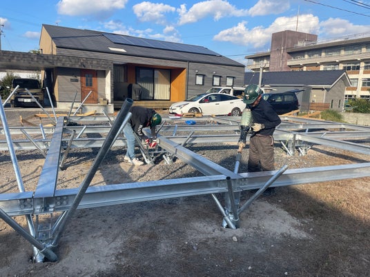 BGF基礎に対し単管パイプを電動ハンマーで打ち込んでいくだけ。土台の基礎となるベースができあがります。