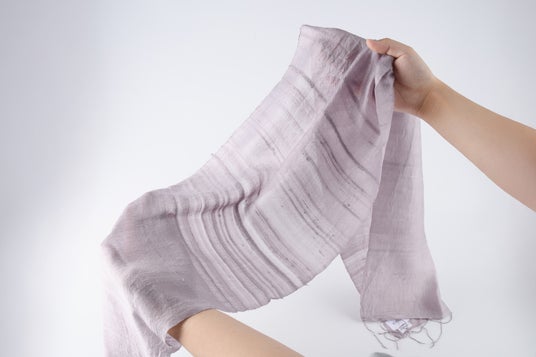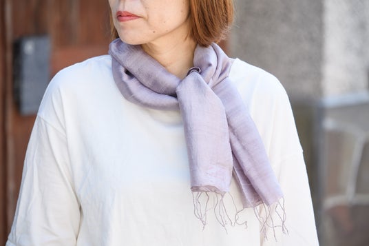 染め方は、染料を溶かしたクエン酸入りのお湯にストールを浸し、絞った後、石灰水に浸す工程を2度繰り返します。すると、シルクのストールが上品で鮮やかな薄紫色に染め上がります。