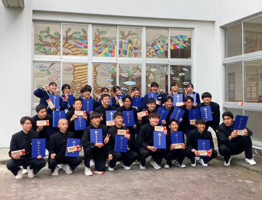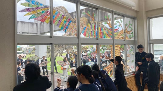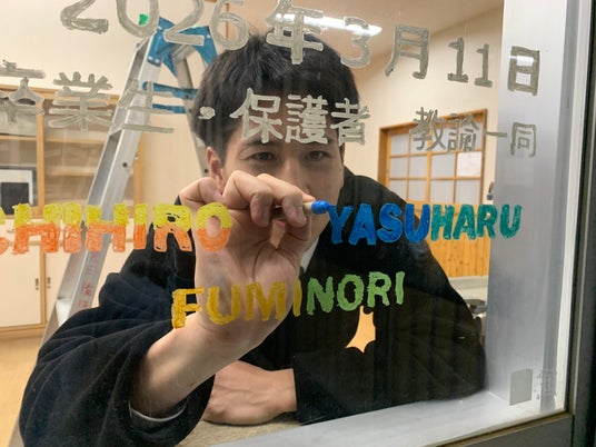 2026年3月11日、知名町立知名中学校(第68回卒業式)にて、卒業生27名へのサプライズとして「卒業ウィンドウアート」が披露されました。本プロジェクトは、地元紙での掲載に続き、本日3月25日(水)18時頃より、NHK鹿児島放送局のニュース番組内でも、その温かな制作の裏側が紹介される予定です。