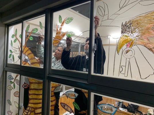 卒業式当日、登校した27名の生徒たちを待っていたのは、窓一面に描かれた鮮やかなウィンドウアートでした。前日の下校後から深夜23時まで、アーティスト佐藤周作氏と共に、保護者20名、そして校長、教頭、担任をはじめとする教職員が、一つひとつの羽に生徒への願いを込めて描き上げたものです。