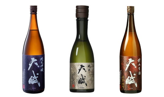 (左から「天賦 純米吟醸」「天賦 純米酒」「天賦 純米吟醸 赤磐雄町 搾立生酒」)